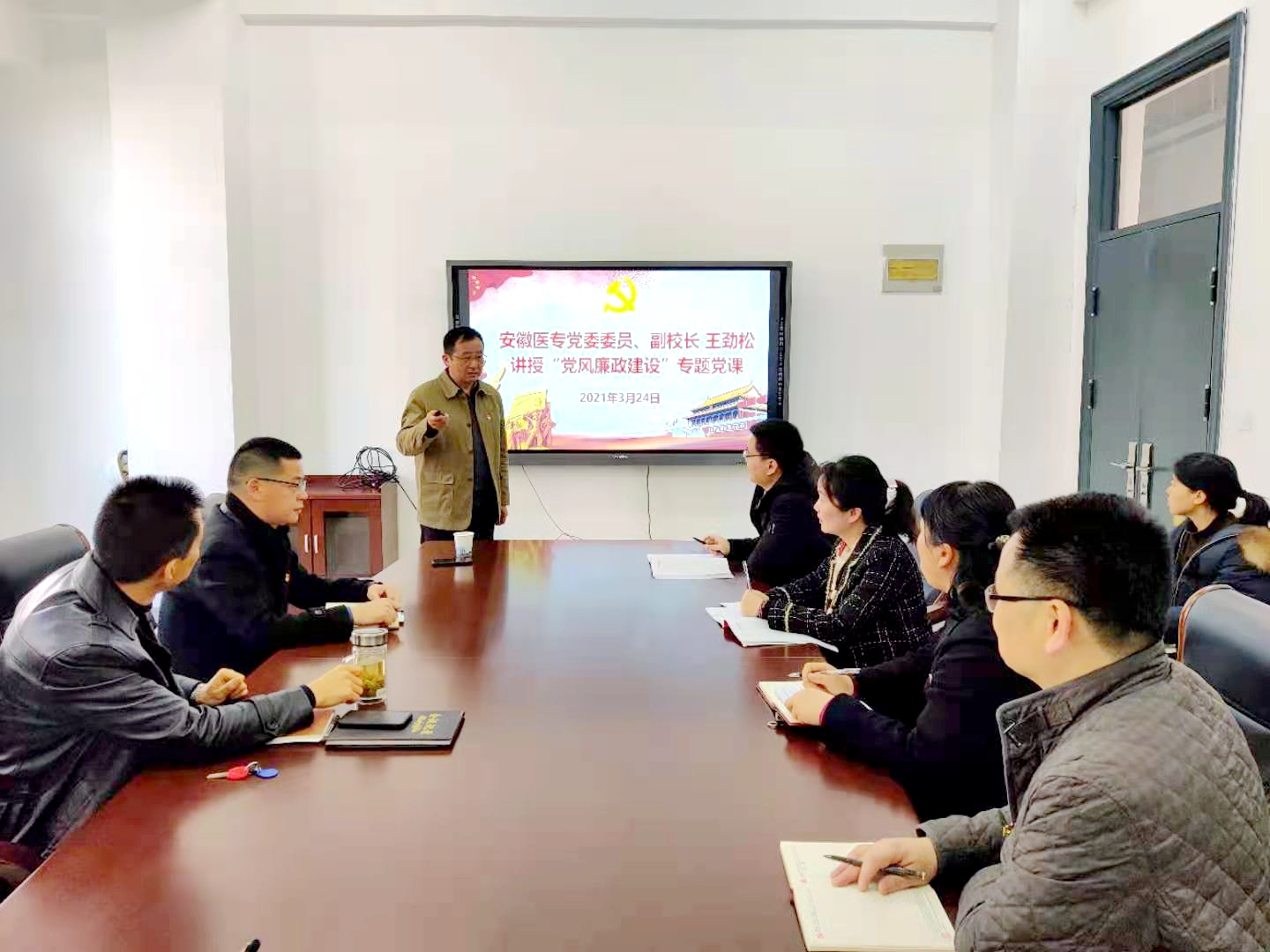 为加强党风廉政建设,推进全面从严治党,将“一岗双责”落到实处,3月24日上午,校党委委员、副校长王劲松为机关党总支第八党支部(总务处)和机关党总支第九党支部(保卫处)全体党员讲授了一堂题为“坚守廉洁心杜绝...