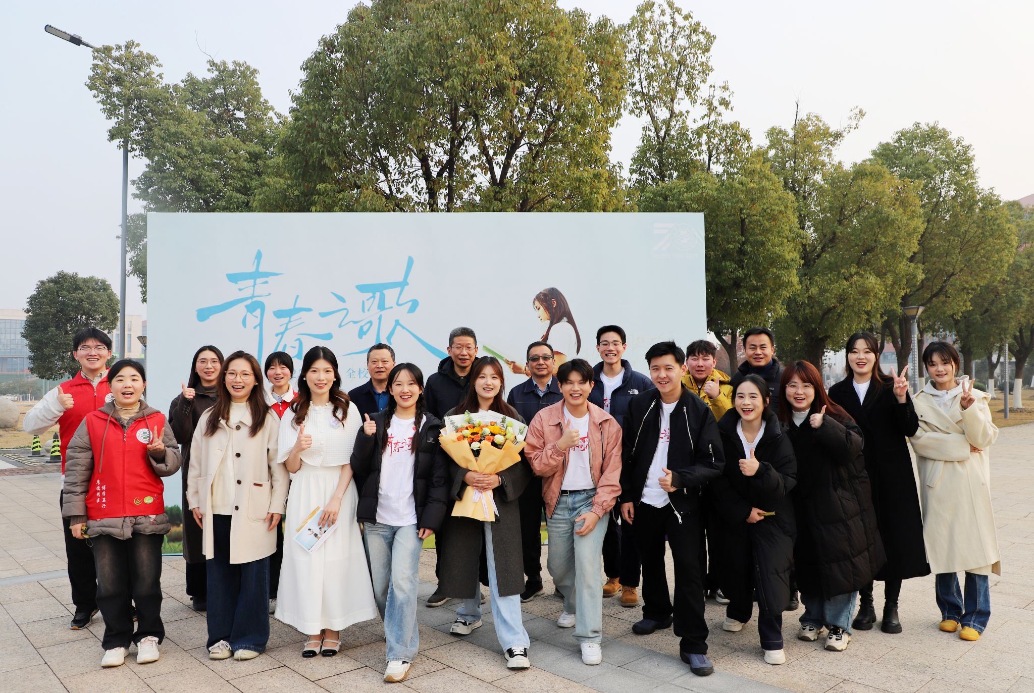 首映礼现场,印着“青春之歌响山河”字样的海报前热闹非凡,师生们纷纷提笔签名,以笔墨传递对学校七十华诞的诚挚祝福与青春理想的美好期许。签名墙上,稚嫩笔触与成熟字迹交相辉映,恰如跨越时空的对话,呼应着影片“传承”的核心主题。