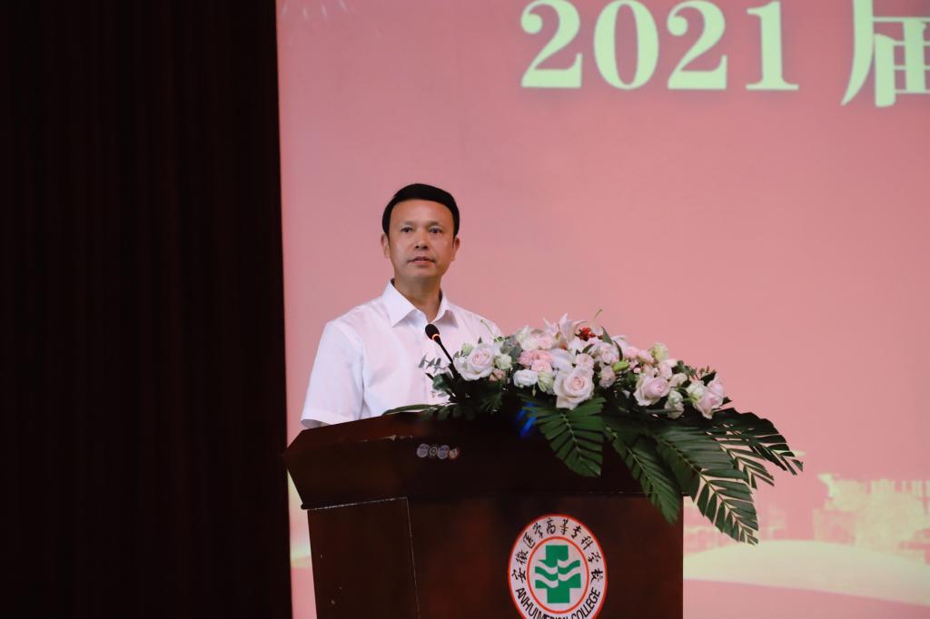 郑为超代表学校,向联合培养的普通专升本2021届本科毕业生顺利毕业表示祝贺,并寄语同学们,在建党百年之际,作为健康中国建设者的一份子,要与人民群众的卫生健康事业发展同向同行、共同前进,应当不负时代和青春,努力成为堪当民族复兴重任的时代新人。希望同学们传承自强精神,磨砺坚韧意志,传承中华民族自立自强的精神,从百年党史中汲取精神和智慧,身体力行,磨砺面对一切困难的坚韧意志,沉着应对人生路上的各种压力与挑战。希望同学们传承奋斗精神,勇于担当作为,医护路上不会一帆风顺,要有坚韧不拔、持续奋斗的坚强意志和磨砺积累、迎难而上的思想准备,要达成“奋斗的共识”,摒弃“躺平的舒适”,做一个能奋斗、敢担当、有作为的有志青年。希望同学们传承医道精神,笃行仁心仁术,弘扬南丁格尔精神,具有爱心、耐心、细心、责任心,在平凡而伟大的护理岗位上承载着执着与坚守、光荣与梦想,竭尽全力为卫生健康事业服务。
