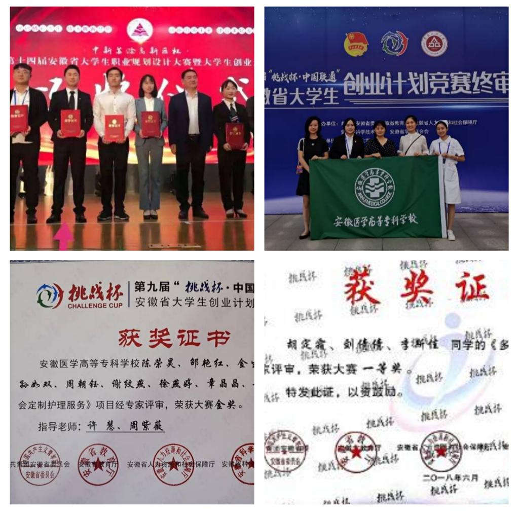 近三年,护理学部学生在省级以上的“互联网+”创新创业大赛及“挑战杯”创业计划竞赛中的成绩,屡创新高:2020年,荣获第十二届“挑战杯”中国大学生创业计划竞赛铜奖1项;2018年,荣获“挑战杯——彩虹人生”全国职业学校创新创效创业大赛二等奖2项;2020年,荣获第九届安徽省“中国联通·挑战杯”大学生创业计划竞赛金奖1项,银奖1项,开云官方端网站登录入口也因此首次捧得挑战杯赛事“优胜杯”;荣获安徽省第六届“互联网+”大学生创新创业大赛铜奖2项;2019年,荣获第十四届安徽省大学生职业规划设计大赛暨大学生创业大赛金奖2项;荣获安徽省第五届“互联网+”大学生创新创业大赛铜奖4项;2018年荣获安徽省第四届“互联网+”大学生创新创业大赛银奖1项,铜奖1项。