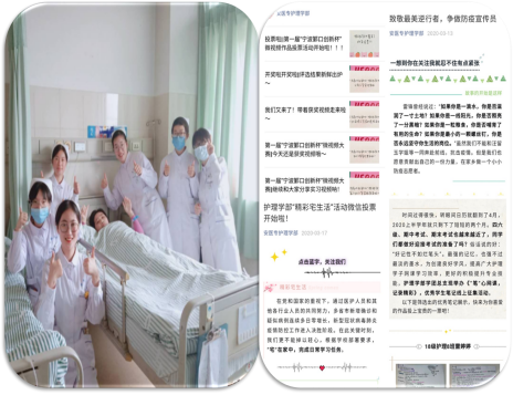 2020年新冠肺炎疫情期间,护理学部40多名学生相应党和国家号召,利用自身护理专业优势,积极投入到当地的疫情防控工作中。他们积极参与志愿服务活动,向当地居民认真宣传科学的疫情防控知识,在“医+志愿服务”的实践活动中充分展现了“健康所系,性命相托”的医学职业精神,以实际行动践行了安徽医专“厚德精医,博学笃行”的校训。2019年,护理学部学生荣获了安徽省优秀大学生(社会实践类)的称号。