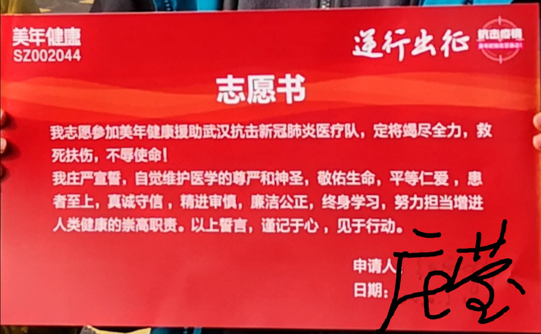 2月13日,当庄莹得知停薪留职的美年大健康公司即将组建医疗队驰援武汉,她第一时间就向单位做了申请,在申请中她说到:“刚得知支援武汉,我以护士身份报名参加,我在感染科和呼吸内科工作过,现在又有放射和CT的工作经验,我又是党员,国家培养我,现在是我回报的时候了。我不想只是待在家里关注疫情,报名参加支援武汉,切切实实为祖国做一点事。”2月20日庄莹以护理组小组长的身份驰援武汉,奋战在抗疫一线,以实际行动践行医学生誓言,彰显医者仁心,奉献无私大爱。