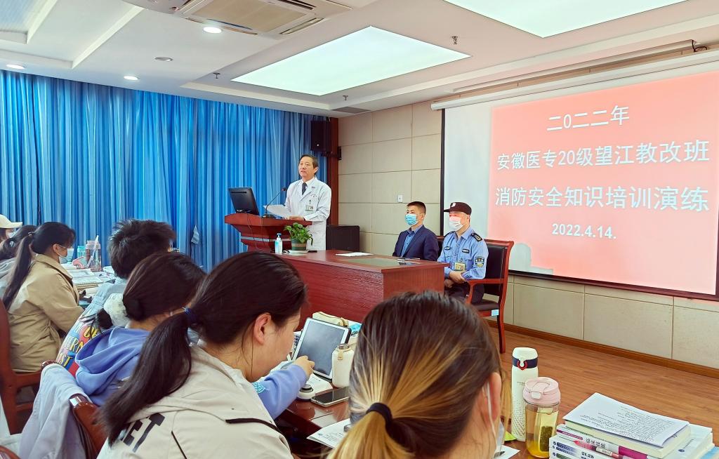 为切实加强学生消防安全工作,提高广大师生消防安全防范意识、安全疏散与自救能力,提升师生在突发性火灾发生时的安全防范和应对能力,保障师生的生命安全,打造平安和谐校园,4月14日上午,望江县医院在医技楼阶梯教室,举行了“珍惜生命,远离火灾”为主题的消防安全知识培训、演练活动。院党委副书记、副院长张建刚、安徽医专20级望江教改班全体学生、部分授课老师参加,医教科副科长胡超主持,保卫科余兴兵科长、消防员余加顺分别给师生进行消防安全知识培训、火灾逃生和现场灭火实战演练指导。