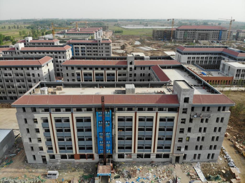 4月,室外体育公园施工全面铺开,运动场地基础建设完成,水系公园基础全部整平,栈桥浇筑完成。塔吊陆续拆除,吊篮安装调试正式投入使用,外墙真石漆喷涂施工,幕墙玻璃、陶土板正式安装。学生宿舍室内入户门、防火门、室内瓷砖、二面腻子基本完成,其余单体陆续顺利进行。