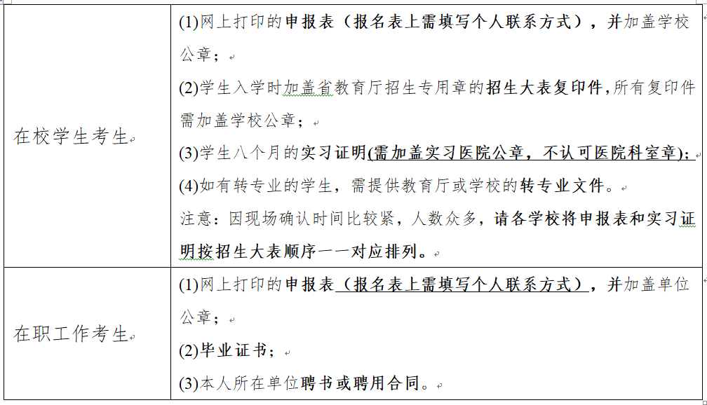 考试报名包括网上预报名和现场确认两个阶段。2023年12月7日-20日期间,考生可登录国家卫生健康委人才交流服务中心网站(原中国卫生人才网www.21wecan.com)完成网上预报名,并在考点规定的现场确认时间内,携带报名申请表(附件1)、身份证、学历证书、临床实习证明以及考点规定的其他材料(包括原件和复印件),到指定地点进行现场确认。