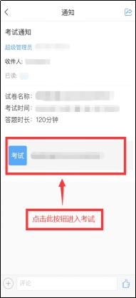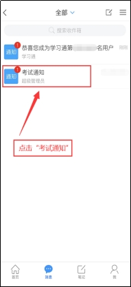点击最下方“消息”,后点击“收件箱”;找到“考试通知”,点击进入;