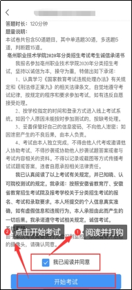 点击考试按钮,阅读并同意考生承诺后进行打钩,点击“开始考试”;
