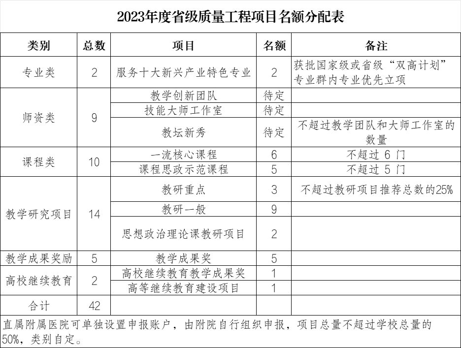 根据安徽省教育厅文件要求,依据《2023年省级质量工程项目申报指南》及《2023年省级质量工程项目申报基数表(高职)》,开云官方端网站登录入口2023年质量工程项目类型、类别及推荐立项限额如下表:
