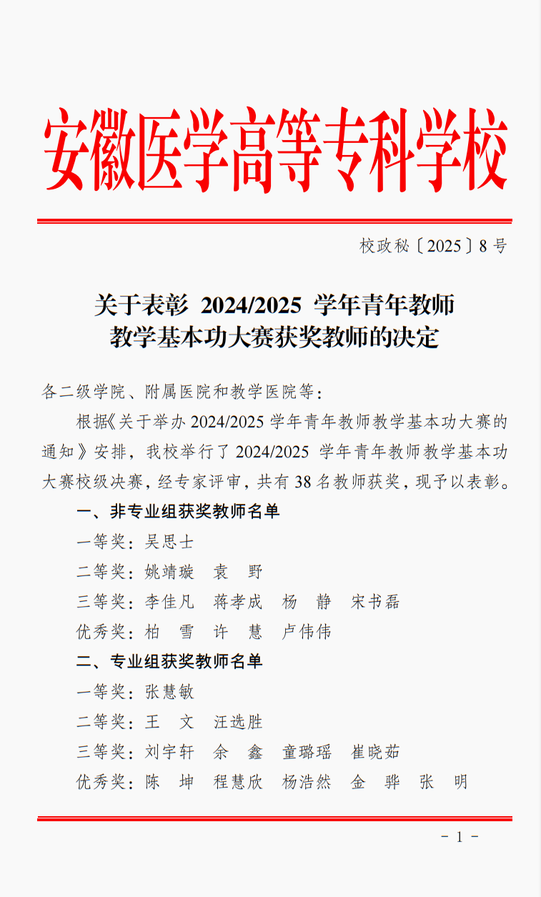 关于表彰2024/2025学年“泛雅杯”安徽医学高等专科学校青年教师教学基本功大赛获奖教师的决定