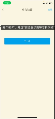 (2)点“下一步”后,在“单位认证”界面输入“1537”,并选择下拉框“安徽医学高等专科学校,然后点“下一步”输入“身份证号”,然后点击确定,绑定成功并完成登录。具体操作如下图: