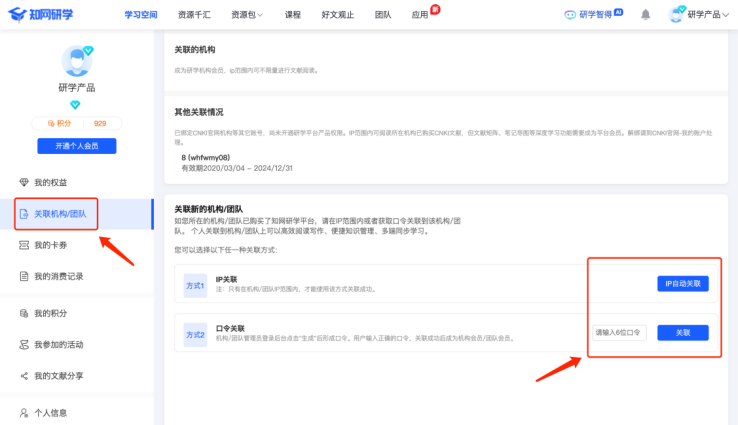 第二步:登录后点击右上角进入个人中心,点击“关联机构团队”选择方式2“口令关联”,输入口令“X96VCL”可发出机构关联申请(申请时请备注学院+姓名),后台管理员通过审核后即可在线使用。