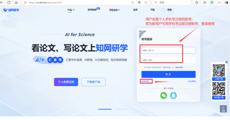 第一步:输入研学平台网址https://x.cnki.net跳转至研学登录页面,手机号注册个人账号,点击登录。