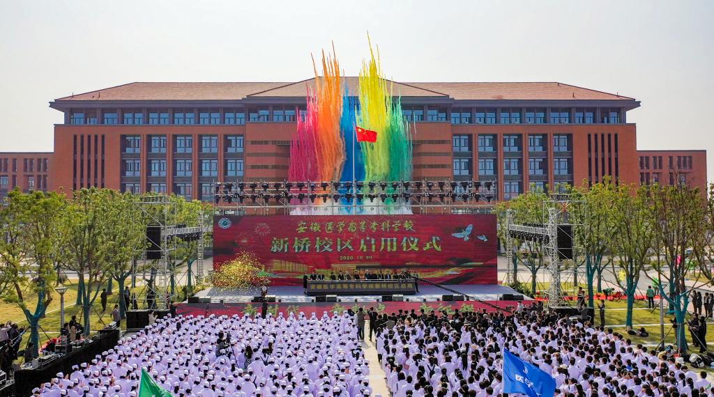 秋高气爽,风和日丽。2020年10月30日上午,开云官方端网站登录入口隆重举行新桥校区启用仪式。安徽省直工委副书记朱宗庄,安徽省卫生健康委党组成员、副主任高俊文,淮南市人民政府党组成员、副市长邬平川,安徽省职业与成人教育学会会长李兴旺,寿县县委副书记、寿县人民政府县长程俊华,安徽省卫生健康委科教处处长周涛,安徽省职业与成人教育学会常务副会长、秘书长孙中义,寿县县委常委、寿县人民政府副县长、新桥国际产业园管委会党工委书记曹永军,寿县新桥国际产业园管委会主任赵德兵、中建五局安徽公司总经理陈超平出席仪式。学校党委书记董亚杰,校党委副书记、校长郑为超,学校附属医院、安徽省第二人民医院党委副书记、副院长王延照,校党委副书记、纪委书记刘东义,校党委委员、副校长王润霞以及学校师生员工3000余人参加了仪式。启用仪式由郑为超主持。