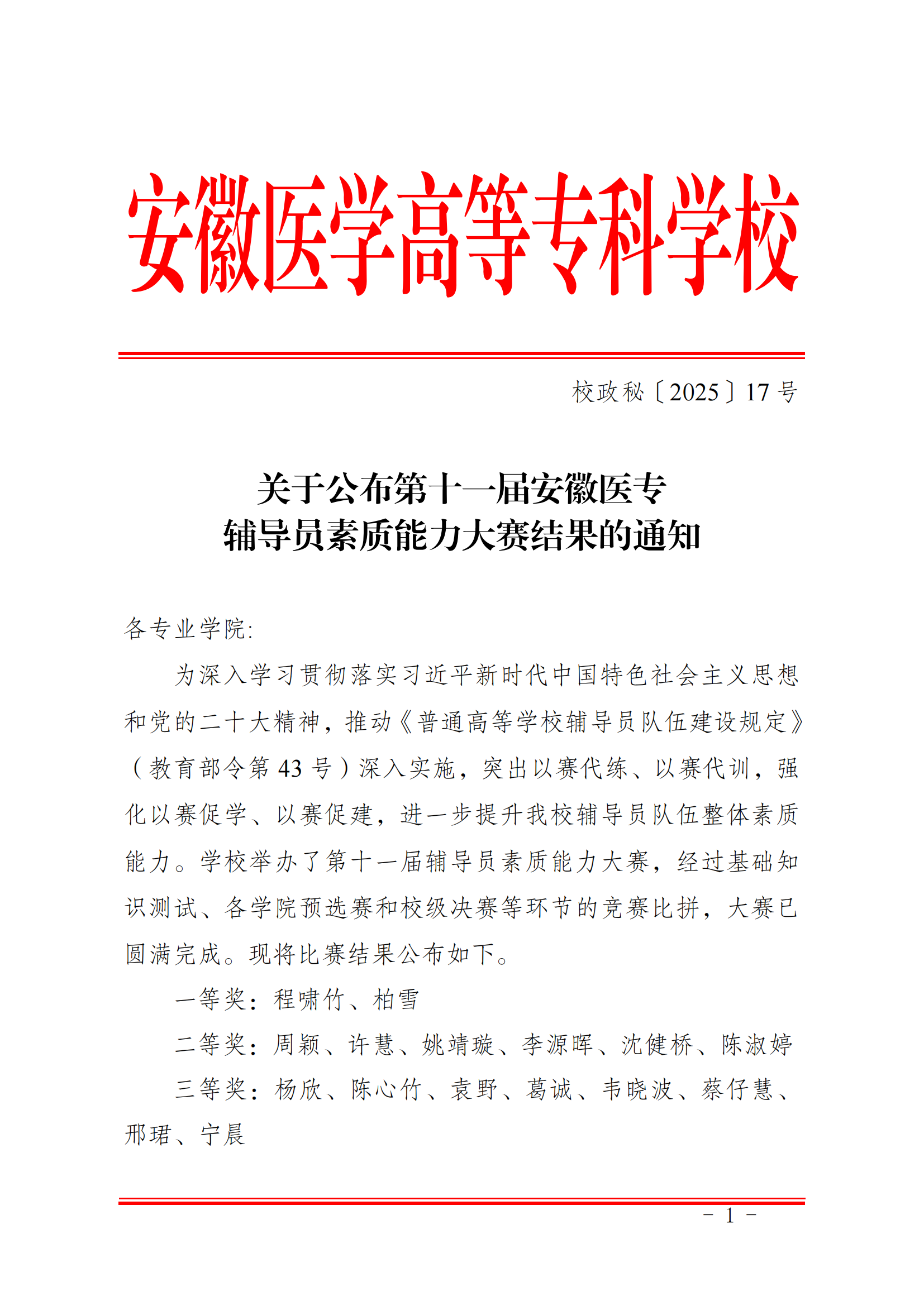 附件【关于公布第十一届安徽医专辅导员素质能力大赛结果的通知.pdf已下载
